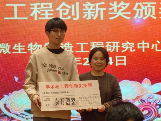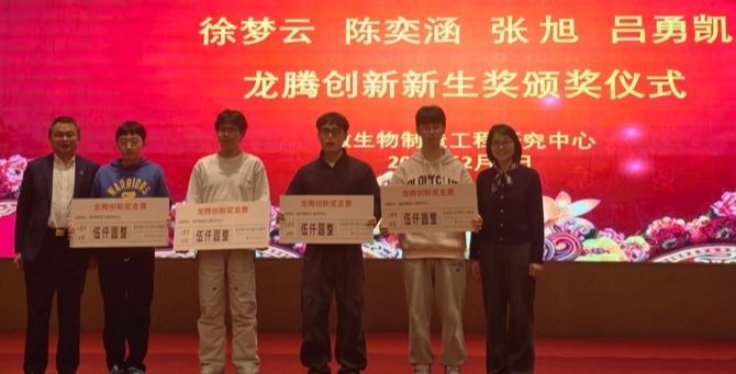 庆典现场对2025年度表现突出的研究生进行表彰,奖项涵盖学术、工程与综合贡献三大维度,以表彰研究生同学在优秀学术论文发表和创新技术的产业化应用,以及在各项工作中的突出表现。同时为吸引更多优秀本科生积极参与研究生推免/报考微生物制造工程研究中心,与两家合作企业设立了用于奖励优秀研究生新生的“龙腾创新新生奖金”。