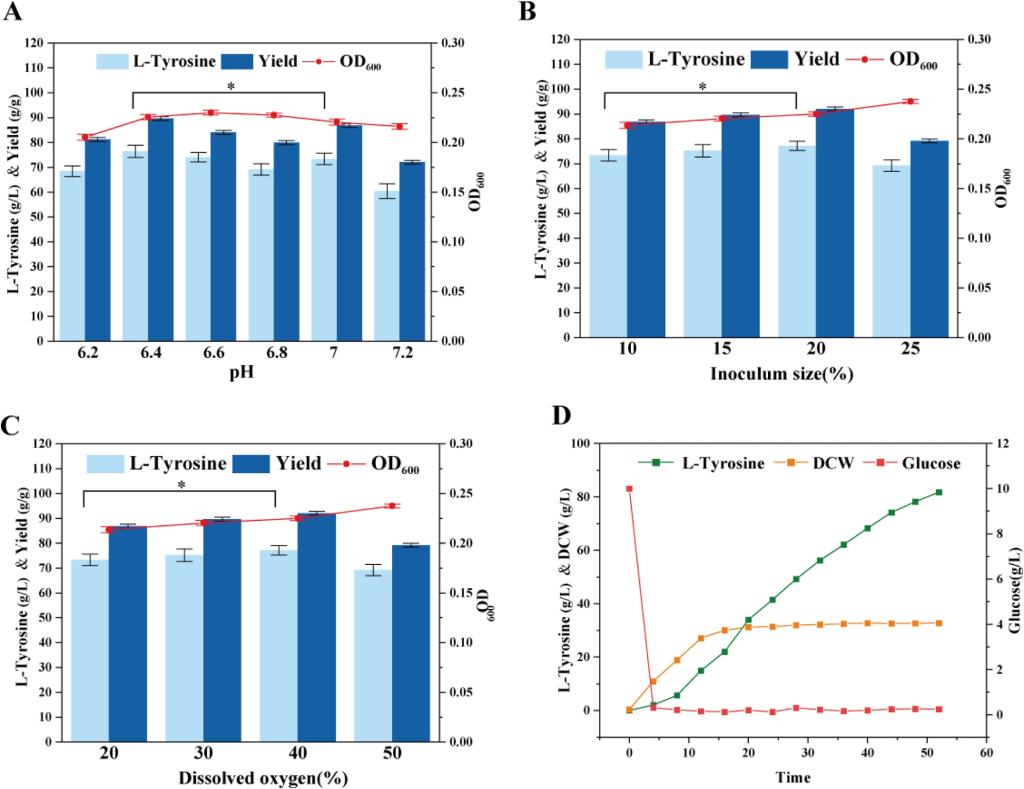 为提高菌株TYR7-3在生物反应器条件下的L-Tyr产量,在5 L搅拌釜反应器中系统评估了关键发酵参数。pH、接种量和溶解氧(DO)水平被选择进行优化,因为这些变量直接影响酶活性、细胞生理学和细胞内通量分布。