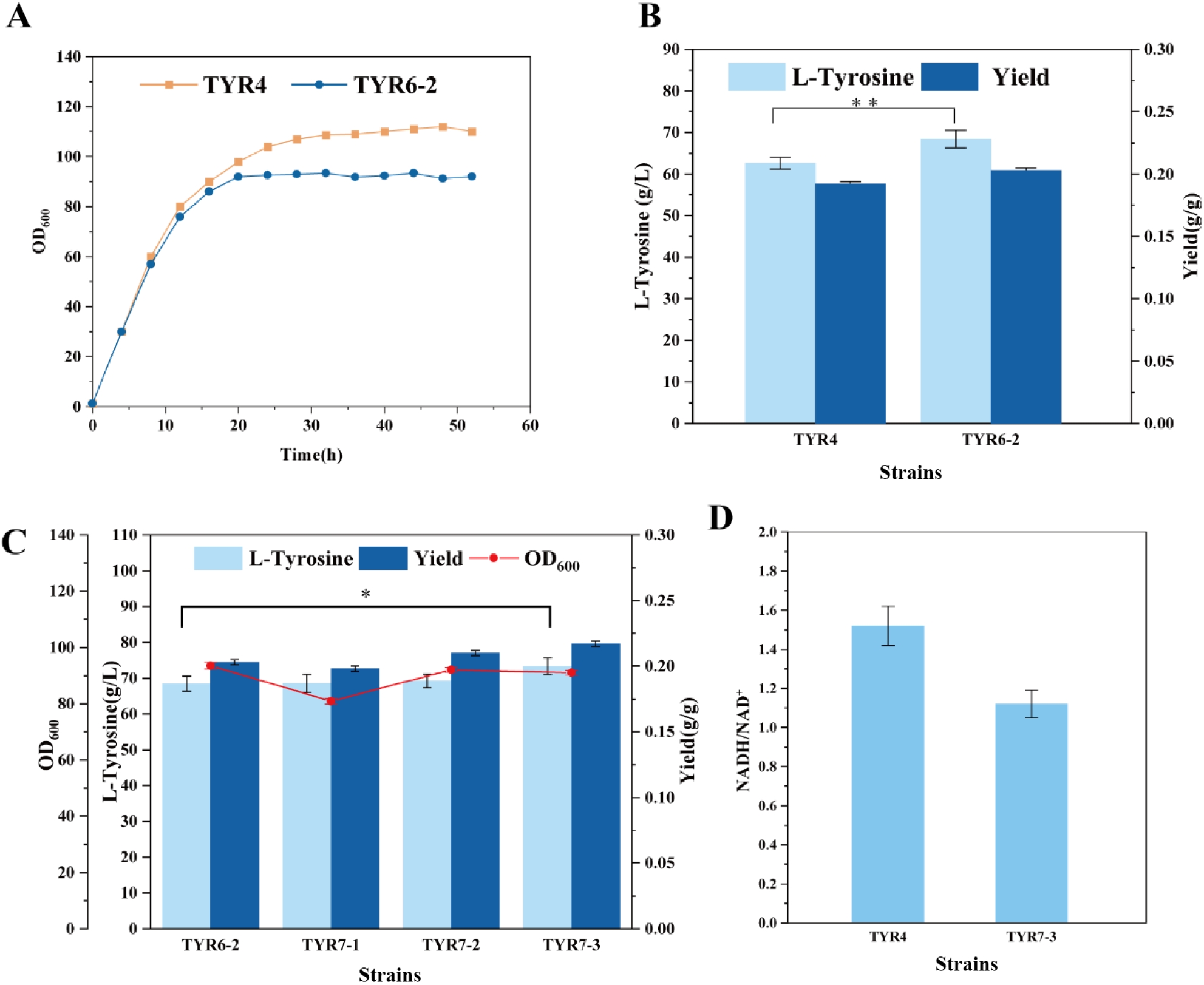 Figure 4. QS系统在5 L生物反应器中的放大验证和进一步优化。(A) 菌株TYR4和TYR6-2生物反应器培养过程中的细胞生长(OD600)曲线。(B) 菌株TYR4和TYR6-2生物反应器发酵中的L-酪氨酸滴度和产率。(C) 整合不同来源gdhA基因对菌株性能的影响。(D) 菌株TYR4和TYR7-3之间细胞内NADH/NAD+比率的比较。