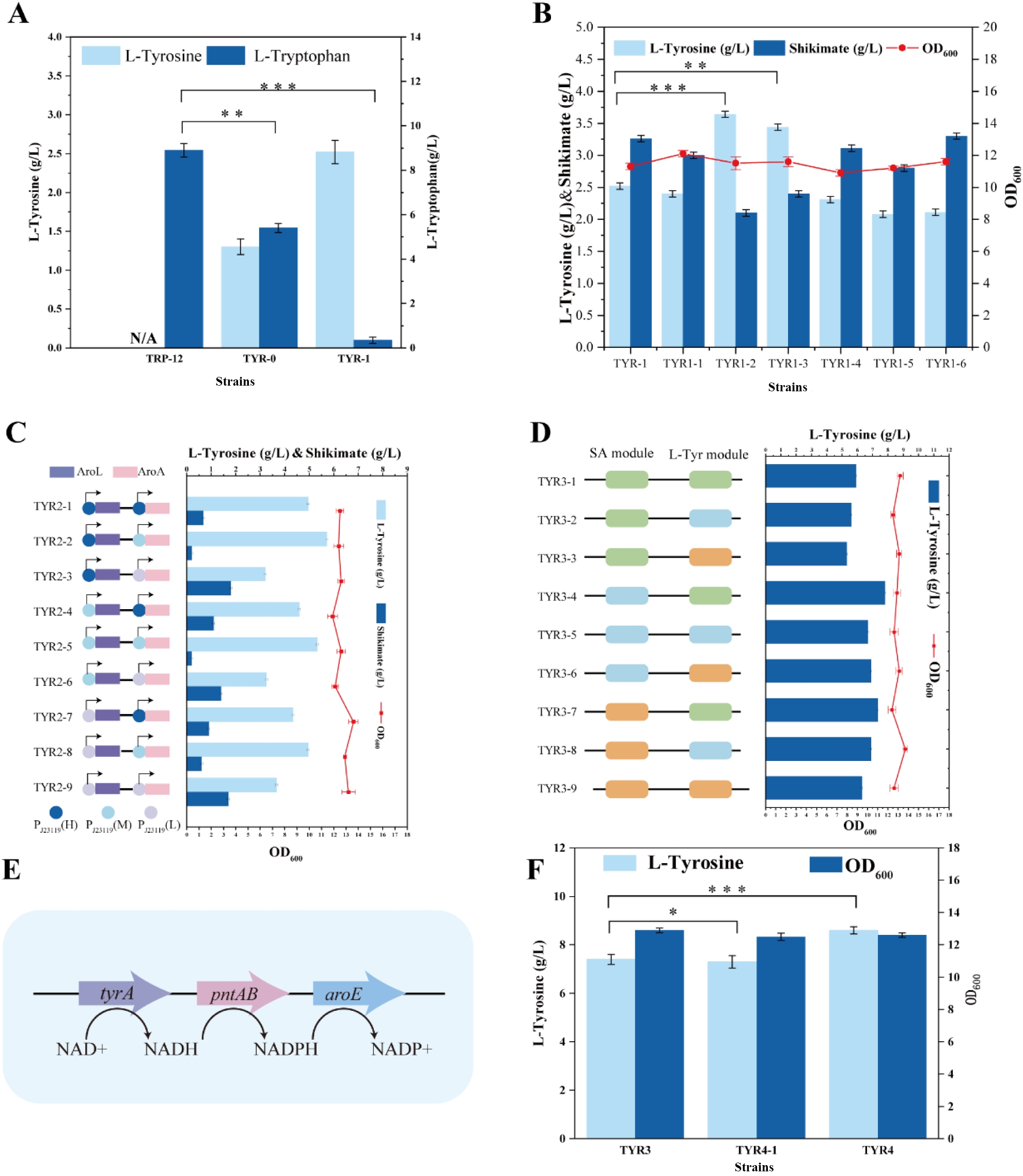 Figure 2. L-酪氨酸生物合成途径的构建和优化。(A) 菌株TRP-12、TYR-0和TYR-1摇瓶发酵过程中的L-酪氨酸和L-色氨酸浓度。(B) L-酪氨酸生物合成模块中关键靶点的摇瓶筛选。(C) 启动子工程实现aroL和aroA的平衡表达。使用不同强度的启动子:H,高表达强度(PJ23119);M,中等表达强度(PJ23108);L,低表达强度(PJ23114)。(D) 通过不同拷贝数质粒调控莽草酸模块和L-酪氨酸生物合成模块表达的L-酪氨酸生产优化。(E) 辅因子协调和优化策略示意图。(F) 辅因子工程菌株摇瓶发酵中的L-酪氨酸生产性能。